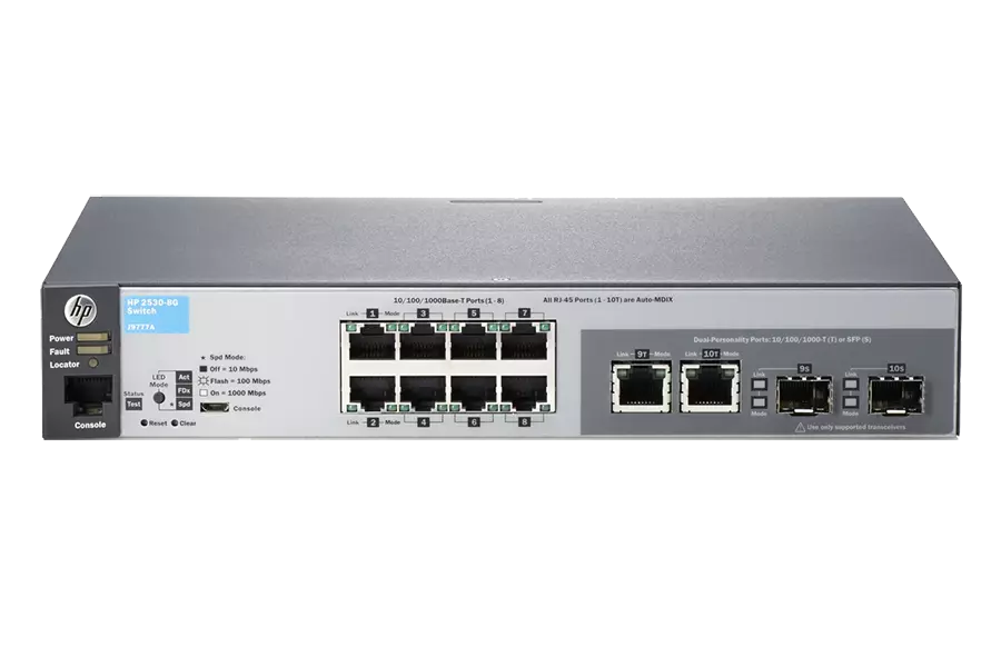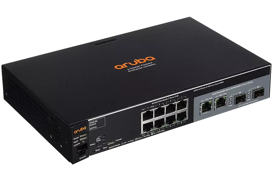 The Aruba 2530 Switch Series offers uplink flexibility with either four Gigabit or two 10 Gigabit Ethernet uplinks on some 24- and 48-port models. The Gigabit 24- and 48-port models have either two small form-factor pluggable plus (SFP+) or four small form-factor pluggable (SFP) slots for fiber connectivity. The Fast Ethernet 24- and 48-port models have two SFPs and two RJ-45 Gigabit uplinks. The compact and fan-less 8-port switches offer additional flexibility with two dual-personality ports that can be used as either RJ-45 Gigabit Ethernet or SFP ports. The PoE+ switch models are IEEE 802.3af- and IEEE 802.3at-compliant with up to 30 W per port, making them suitable for voice, video, or wireless deployments with PoE+