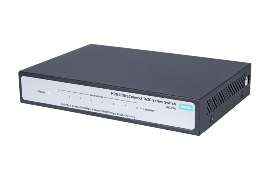 The HPE OfficeConnect 1420 Switch Series features gigabit Ethernet (1GbE) connectivity offering small businesses 10 times the performance of Fast Ethernet with unmanaged plug-and-play simplicity.