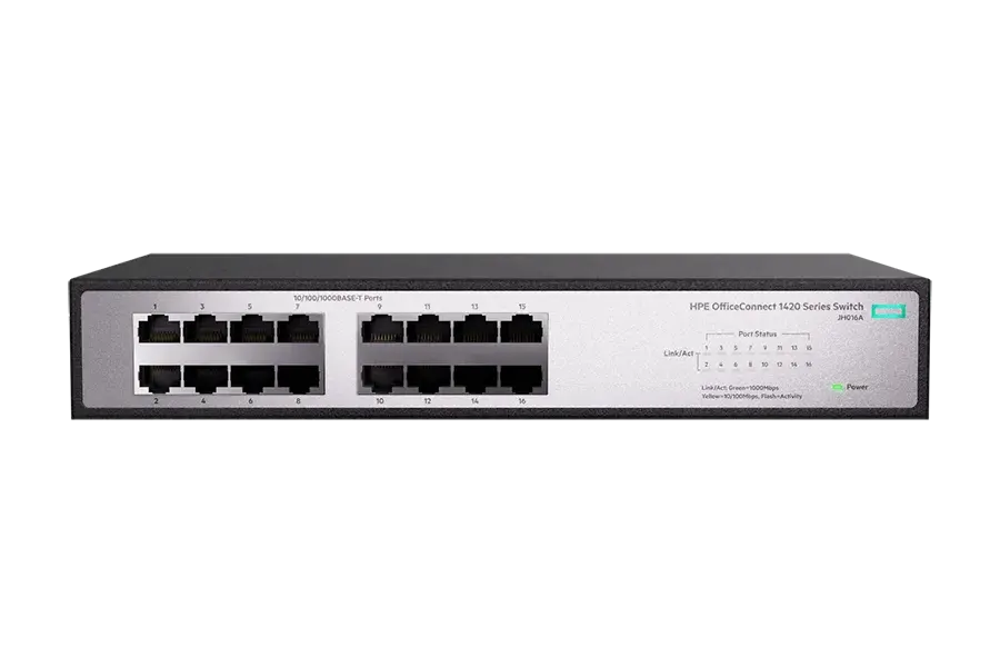 The HPE OfficeConnect 1420 Switch Series consists of unmanaged business-class Gigabit Ethernet switches for small business and others looking for plug-and-play basic Layer 2 connectivity for their network. The 1420 Switch Series includes nine Gigabit switches: 16-port 10/100/1000, 24-port 10/100/1000 with two SFP Gigabit ports, 24-port 10/100/1000 ports of which 12 are Power over Ethernet (PoE+) enabled with a total PoE power budget of 124W, and 24-port 10/100/1000 with two SFP+ 10GbE ports. The 1420 Switch Series also includes a 5-port 10/100/1000, 5-port 10/100/1000 with 4 out of 5 ports as PoE+ ports, an 8-port 10/100/1000, 8-port 10/100/1000 with 8 out of 8 ports as PoE+ ports and a simple 24 port 10/100/1000 switch. They are fanless for silent operation. They come with a limited lifetime Warranty.