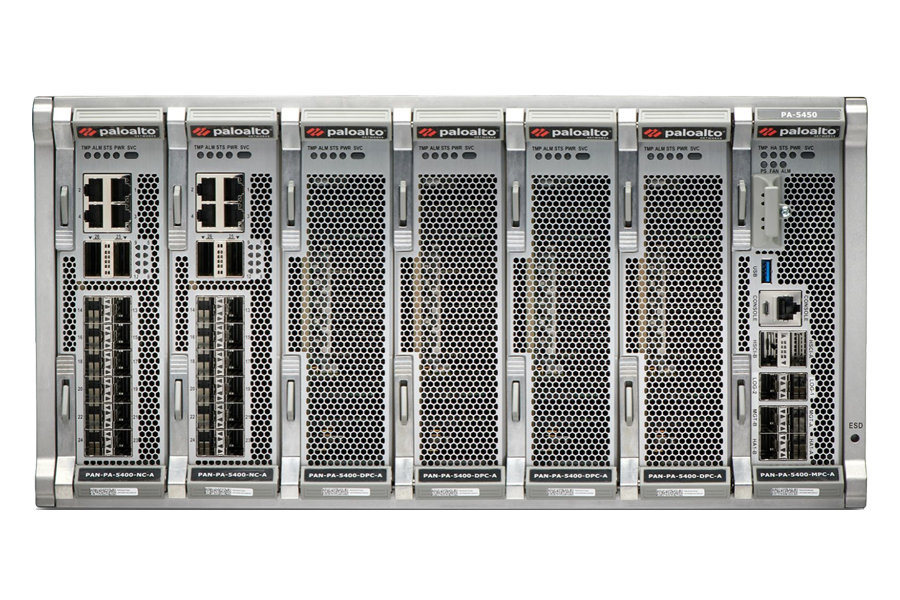 The Palo Alto Networks PA-5450 ML-Powered Next- Generation Firewall (NGFW) platform is designed for hyperscale data center, internet edge, and campus segmentation deployments. Delivering incredible performance—152 Gbps of Threat Prevention throughput with security services enabled—it is based on a scalable, modular design that enables you to increase performance as your needs increase. The PA-5450 offers simplicity defined by a single-system approach to management and licensing