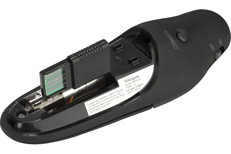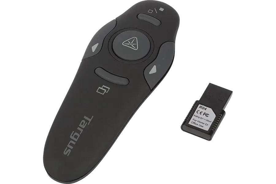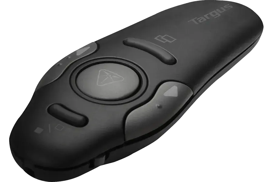 Enquiry Us Contact NowThe Targus Wireless Presenter with Laser Pointer makes it easy to control your presentation from up to 50 feet away. The ergonomic design with soft touch surface makes it easy to hold the device in your hand and navigate through the buttons comfortably. The built-in laser pointer allows you to highlight key points while the other keys allow you to page up, page down, exit/resume presentation mode, and darken screen. The preset RF connection enables true plug-and-play capability; no driver is required.
