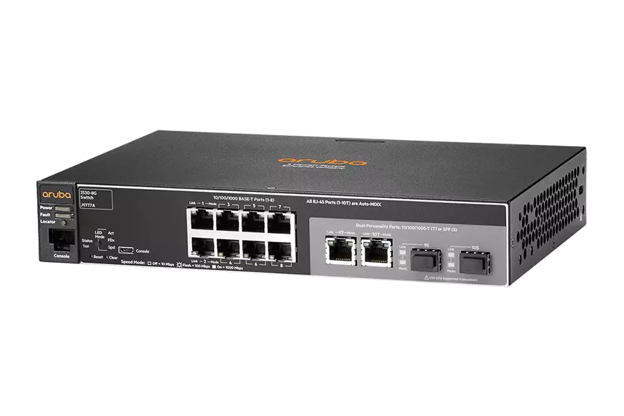 The Aruba 2530 Switch Series offers uplink flexibility with either four Gigabit or two 10 Gigabit Ethernet uplinks on some 24- and 48-port models. The Gigabit 24- and 48-port models have either two small form-factor pluggable plus (SFP+) or four small form-factor pluggable (SFP) slots for fiber connectivity. The Fast Ethernet 24- and 48-port models have two SFPs and two RJ-45 Gigabit uplinks. The compact and fan-less 8-port switches offer additional flexibility with two dual-personality ports that can be used as either RJ-45 Gigabit Ethernet or SFP ports. The PoE+ switch models are IEEE 802.3af- and IEEE 802.3at-compliant with up to 30 W per port, making them suitable for voice, video, or wireless deployments with PoE+